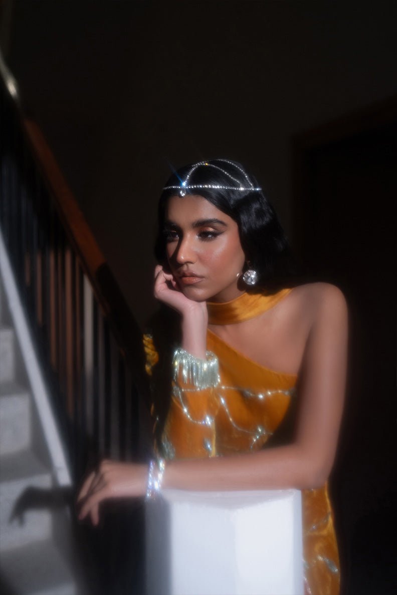 Dress is hand embellished with chain and crystals.