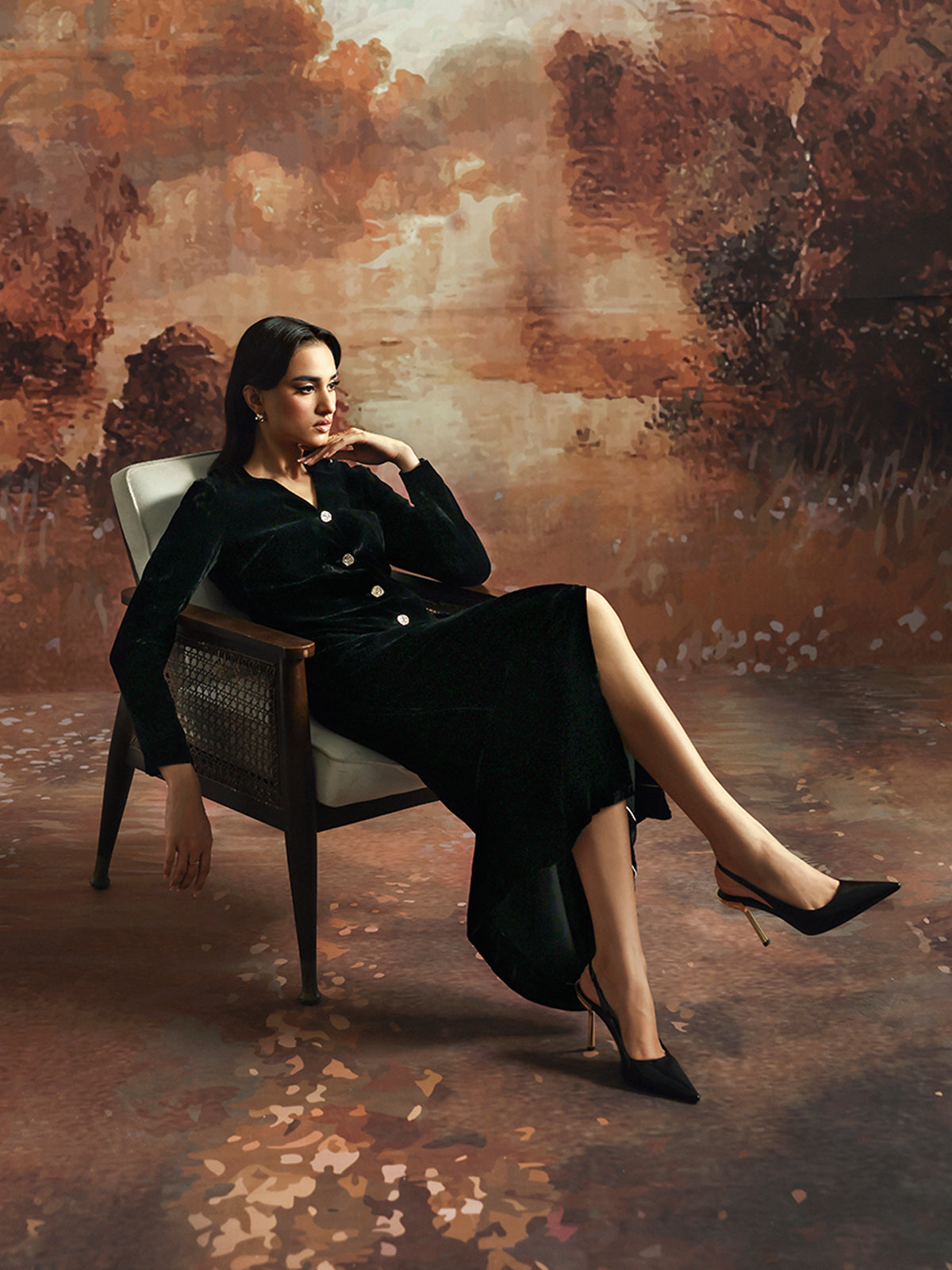 A masterclass in contrast, this black velvet outfit balances the richness of velvety texture with clarity of structure, exuding timeless sophistication.