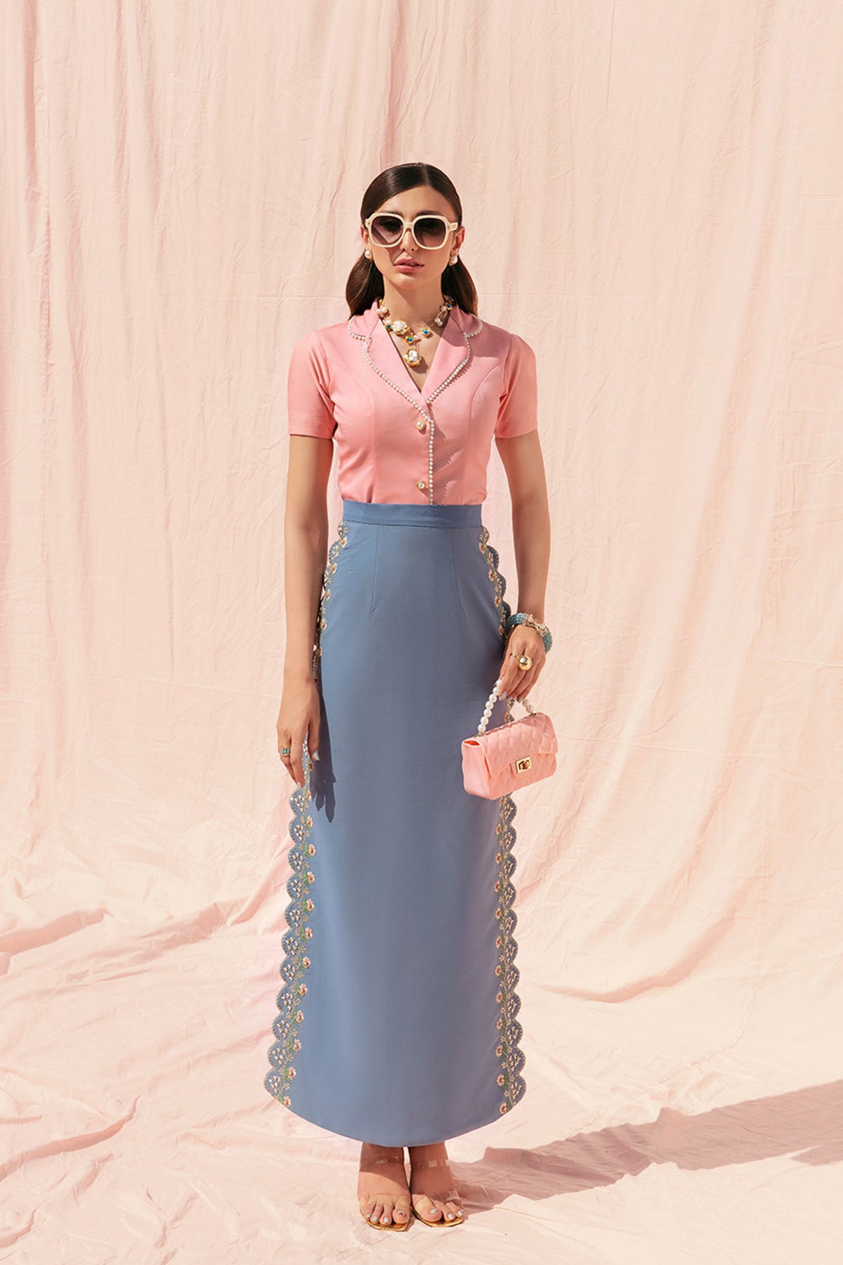 Imagine yourself strolling down a sun-drenched street, the breeze catching the playful silhouette of this two-piece set. "Mirabelle" features a button-down shirt paired with a long skirt, both rendered in a captivating blend of vivid pastels and inspired by the iconic 60s color palette.