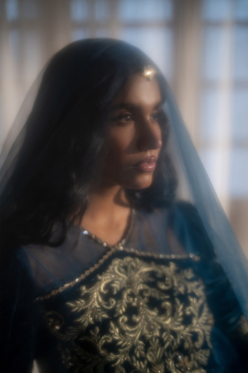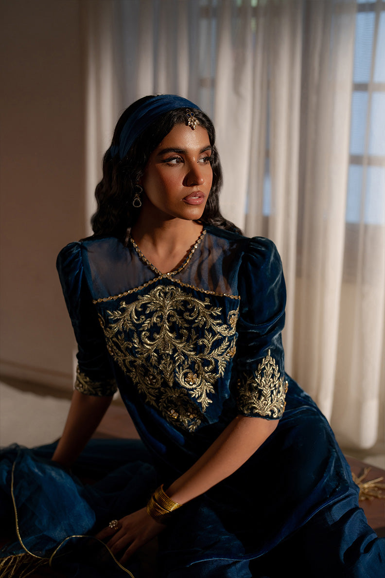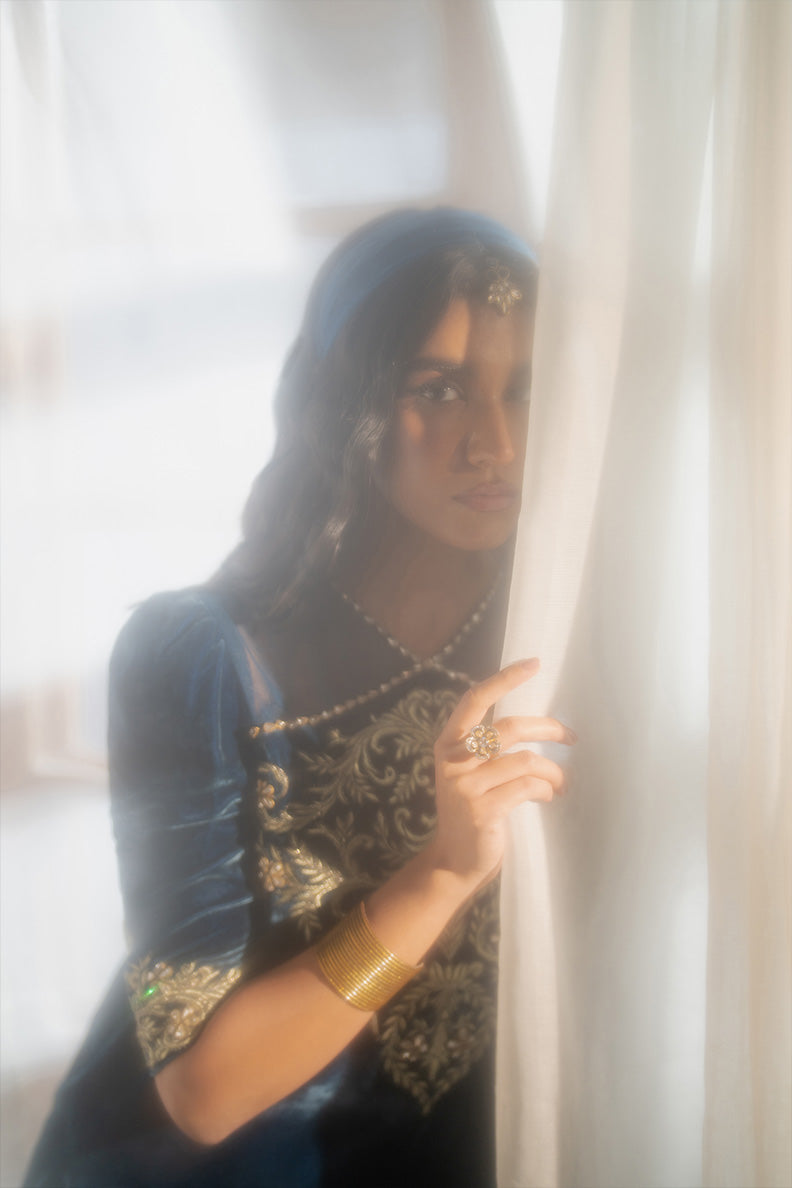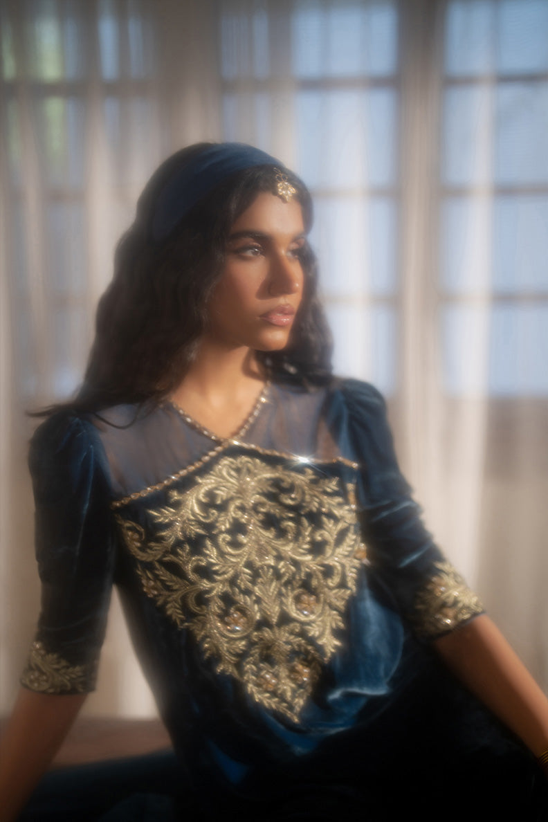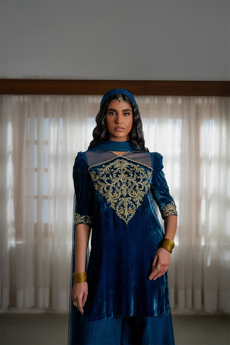 The shirt fabric is velvet, trouser raw silk and dupatta net. the outfit is hand embroidered