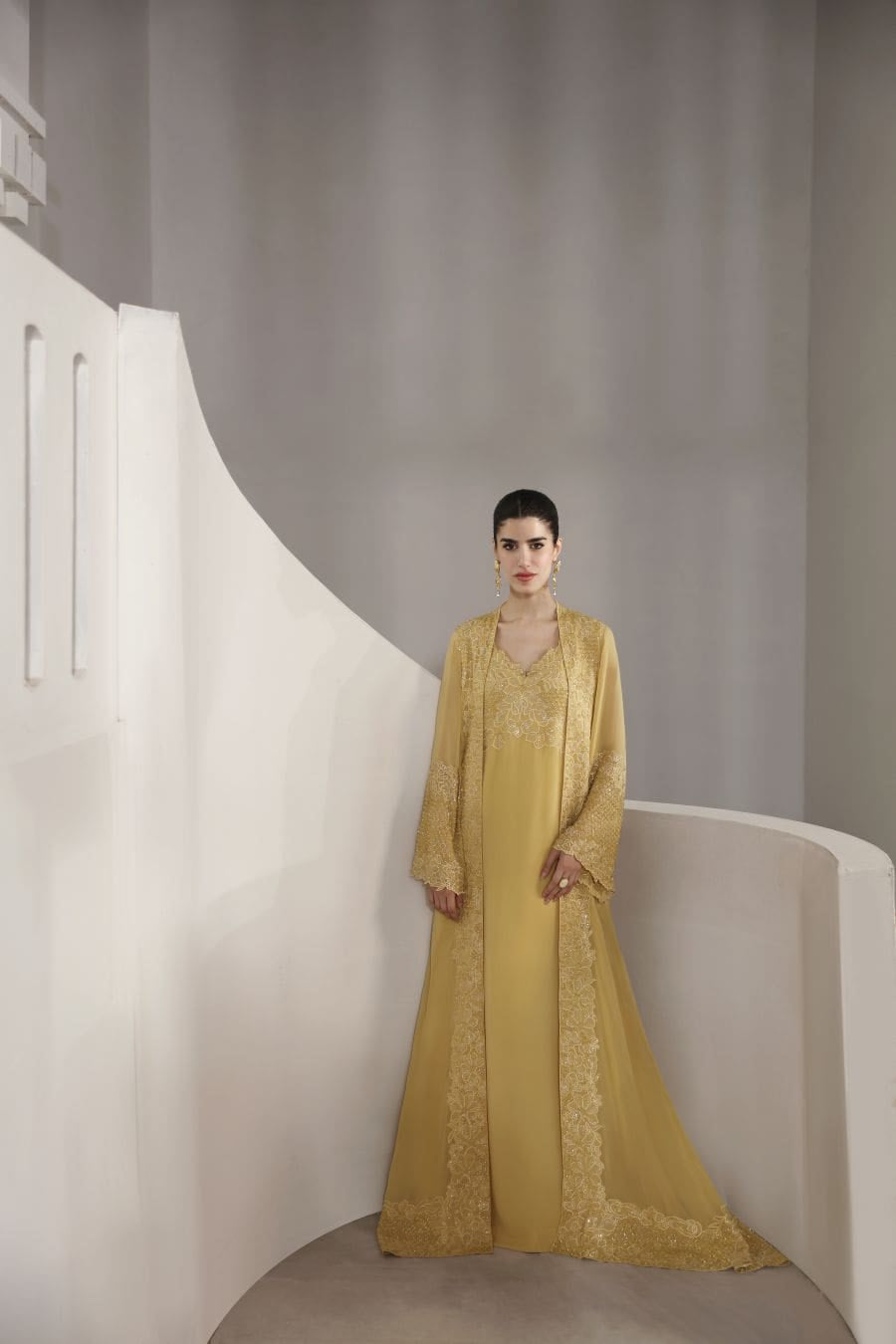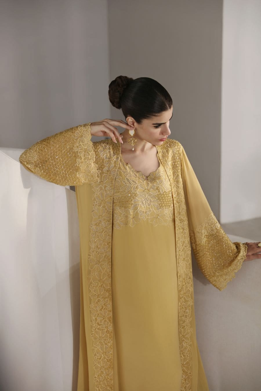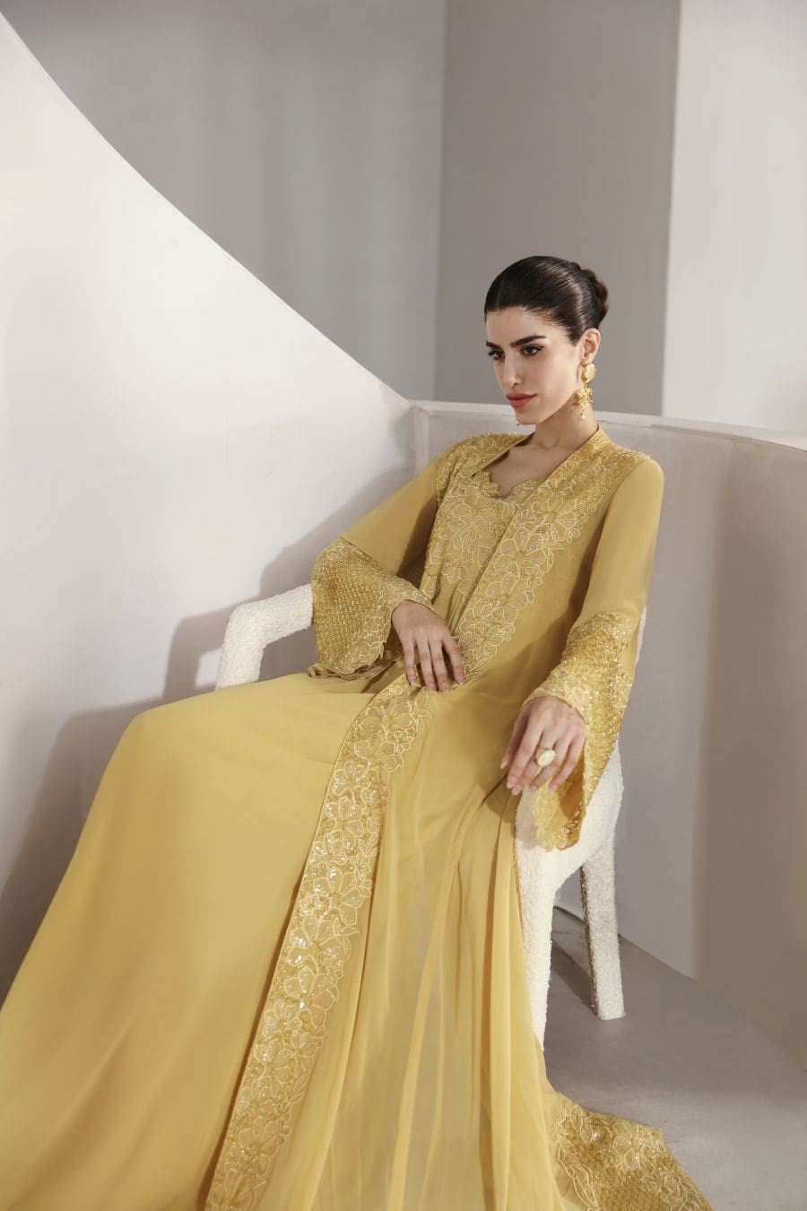 Imagine yourself gliding across the room, a vision in this ethereal chiffon gown. Adorned not merely with embellishments, but with a constellation of dazzling crystals, each shimmering like a captured star. Intricate hand embroidery weaves a tapestry of artistry across the fabric, transforming the gown into a true work of art.